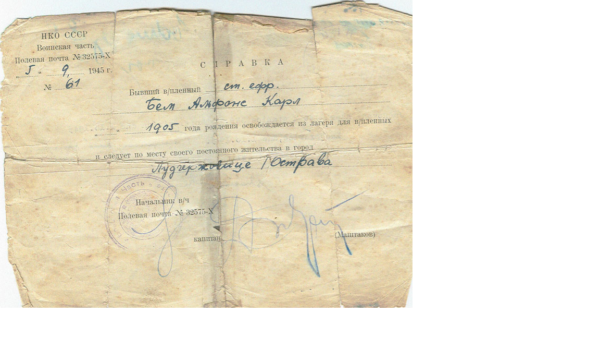 Dne 08. 04. 1945 byl také zajat sovětskou armádou ve stodole. Po několika dnech bez jídla byl převezen do tábora Rüdensdorf u Berlína. Dne 05. 09. 1945 byl repatriován do Československa. V táboře, krátce za hranicemi, prožil těžké časy. Podnikl několik pokusů o útěk a při jednom z nich se mu podařilo uprchnout. Tři týdny se pěšky protloukal přes Jizerské hory, Krkonoše, Orlické hory a Jeseníky domů do Ludgeřovic, kde se dne 1. října 1945 přihlásil k pobytu. Rodný domek našel vypálený válkou, hned se pustil do jeho opravy.