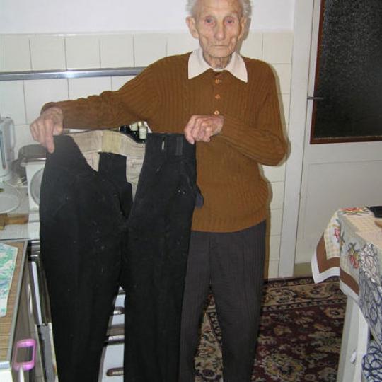 Alfons Böhm ukazuje kalhoty své tankistické uniformy, ve kterých v roce 1945 zažil pád Berlína, byl v sovětském zajetí, v pracovním záboře na hnědouhelném dole, v nichž došel koncem září 1945 zpět domů.