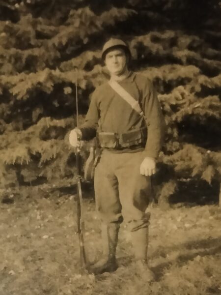 Jindřich Janoš ve své staré Francouzské uniformě v táboře Cholmondeley v parku.