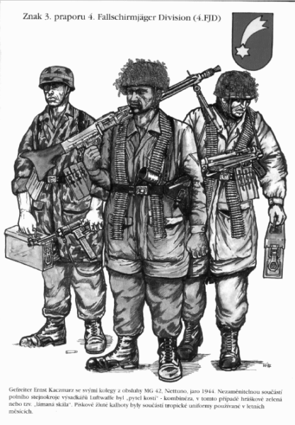 Kresba Ernsta Kaczmarze (uprostřed) a jeho kolegů z 3. praporu 4. Fallschirmjäger-Division z časopisu Revi 1