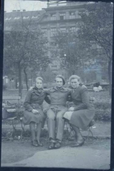 Richard Macošek jako vojín obrněné brigády se svou sestrou Adolfinou a Annou Fišerovou v Praze roku 1945.