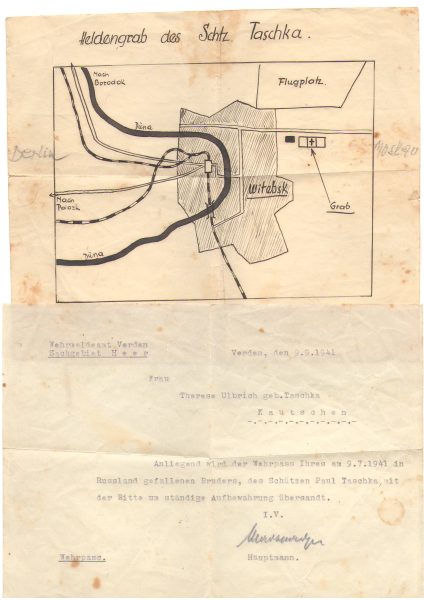 Paul Reinhold Taschka narukoval k Wehrmachtu 17.06.1940. Byl zařazen k pěchotě k rotě náhradního pěšího praporu – 2. Kompanie Infanterie-Ersatz-Bataillon 90. Tento prapor sloužil jako zajišAYovací oddíl od 20.05.1940 v Dánsku a byl podřízen 190.Division (divizi). Dne 08.08.1940 byl prapor přemístěn do Ratzeburg/Schleswig-Holstein (Šlesvicko-Holštýnsko). Dne 25.08.1940 byl Paul převelen k rotě pěšího náhradního praporu – 2.Kompanie Infanterie-Ersatz-Bataillon 20 a přemístěn do Francie. Dne 03.04.1941 byl převelen k rotě pěšího pluku – 6.Kompanie Infanterie-Regiment 90. Tento pluk spadal pod 20. Infanterie-Division (pěší divizi). Od léta 1941 bojoval pluk na východní frontě v oblasti Staraja Russa-Novgorodská oblast/Rusko a Volchov-Leningradská oblast/Rusko. Dne 09.07.1941 východně od Vitebska-Vitebská oblast/Bělorusko při útoku na toto město Paul padl. Průstřel hlavy (Kopfschuss). Byl pohřben na vojenském hřbitově Vitebsk II. Nedávno byly jeho ostatky přemístěny na nově zřízený válečný hřbitov v Šatkovo-Bobrujsk-Mogylevská oblast/Bělorusko. Protože jeho ostatky nemohly být identifikovány je umístěn mezi neznámými vojáky. Našel zde svůj poslední a důstojný odpočinek.