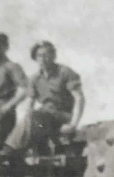 Wilhelm Wawrzinek sedící uprostřed trojice mužů na věži tanku Cromwell.