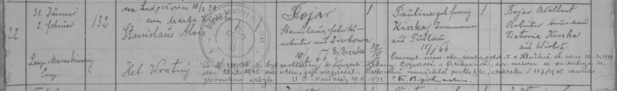 Stanislaw (Stanislaus) Alois Bojar wurde in Hruschau geboren. Er wurde am 02.02.1903 getauft. Später heiratete er oder umgezogen zur Marta Lischka in Ludgerstal. Er lebt in Petershofen und Ludgerstal.