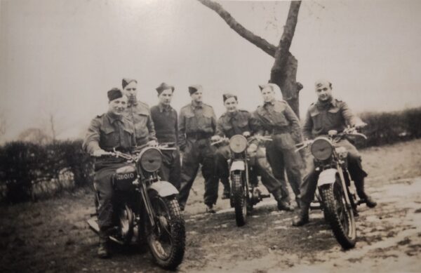 Eine Gruppe Motorradfahrer der tschechoslowakischen Gemischten Brigade in Großbritannien. Wilhelm Dworzak steht als Erster von links.