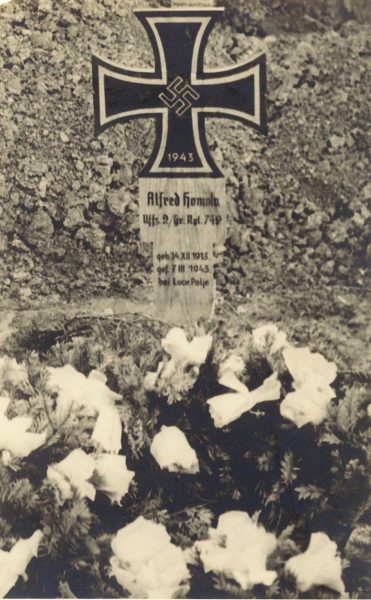 Alfred Homolla diente in der 2./Grenadier-Regiment 749, unterstellt der 717. Infanterie-Division (Div. Kommandeur Gen.Lt. Benignus Dippold). Die Einheit kämpfte im Rahmen der 12. Armee in Kroatien.
