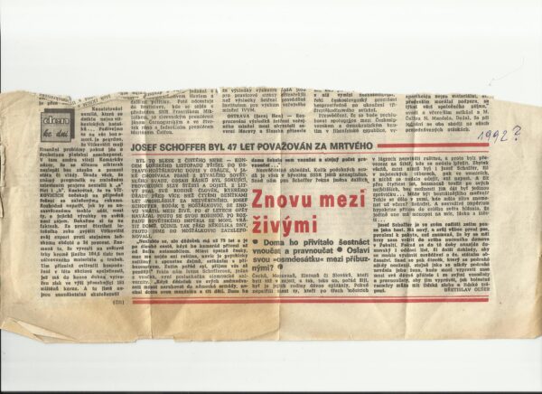 Ein unglaubliches Wiedersehen. Wie viele ähnliche Schicksale gibt es jedoch noch in der ehemaligen UdSSR, die noch nicht erfüllt sind. Vielleicht nennt uns Herr Schoffer die Namen weiterer Tschechen, Mährer, Schlesier oder Slowaken, die ebenfalls in Gefangenschaft waren und wie er noch leben, obwohl ihre Familien sie längst betrauert haben. Sofern sie nicht zu denen gehörten, die nach drei Monaten in den Lagern die russische Sprache nicht beherrschten und deshalb nach Sibirien gebracht wurden, wo es unmöglich war zu überleben. Der Rest der Gefangenen, darunter auch Josef Schoffer, lebte in Gefangenenlagern, dann in Dörfern, aus denen man weder weggehen noch schreiben konnte. Und über vierzig Jahre lang zu leben, hilflos nach seinen Nächsten zu verlangen, ohne ihnen auch nur eine einzige Nachricht zukommen zu lassen… Gibt es eine grausamere Folter? Dies geschah in einem Land, in dem morgen schon gestern bedeutete? Leider ja. Und das feindselige Imperium der Heuchelei verkündete dabei der ganzen Welt, dass nur es allein das Monopol auf Frieden, Liebe und Glück habe…
